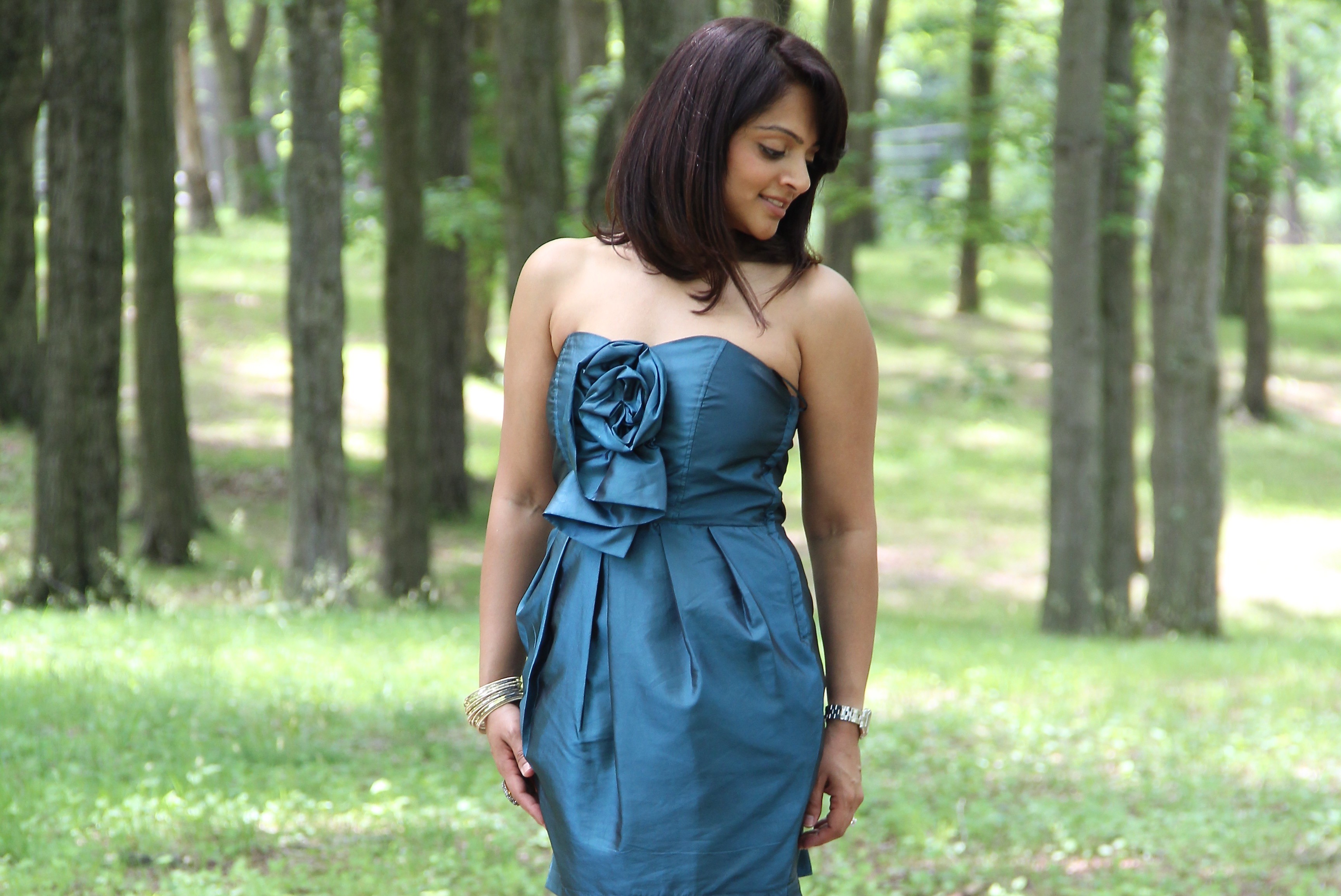 This is where Nina got risky and came out with the biggest reward! She realized that she had a skirt of an Indian outfit that had work on it that matched the same color of her dress (the dark teal color). She figured to put the two together just to see what it looked like, turns out it worked! It created a long anarkali look that seems to be trending these days. It was a definite hit at the party too as it was a twist that was still Indian inspired!